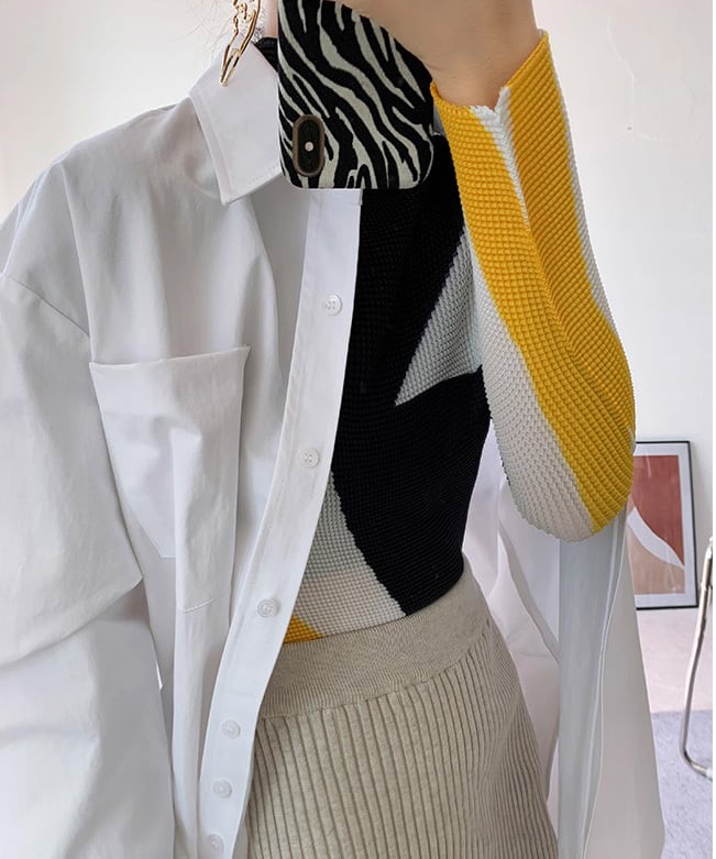 プリーツの陰影と絶妙な大人ハイネックが映えるトップス。