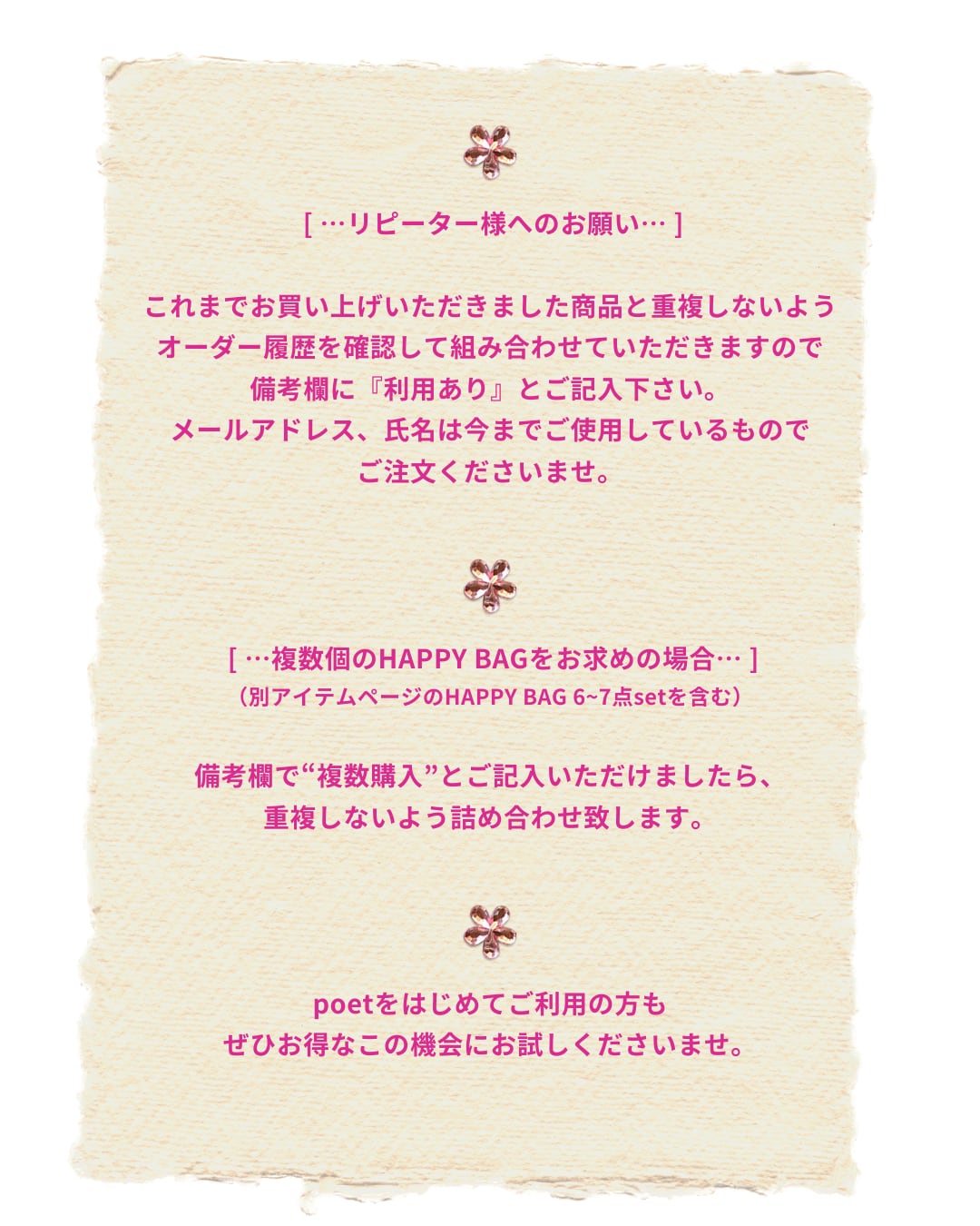 ・複数個のHAPPY BAGをお求めの場合(別アイテムページのHAPPY BAG 5~7点setを含む)
